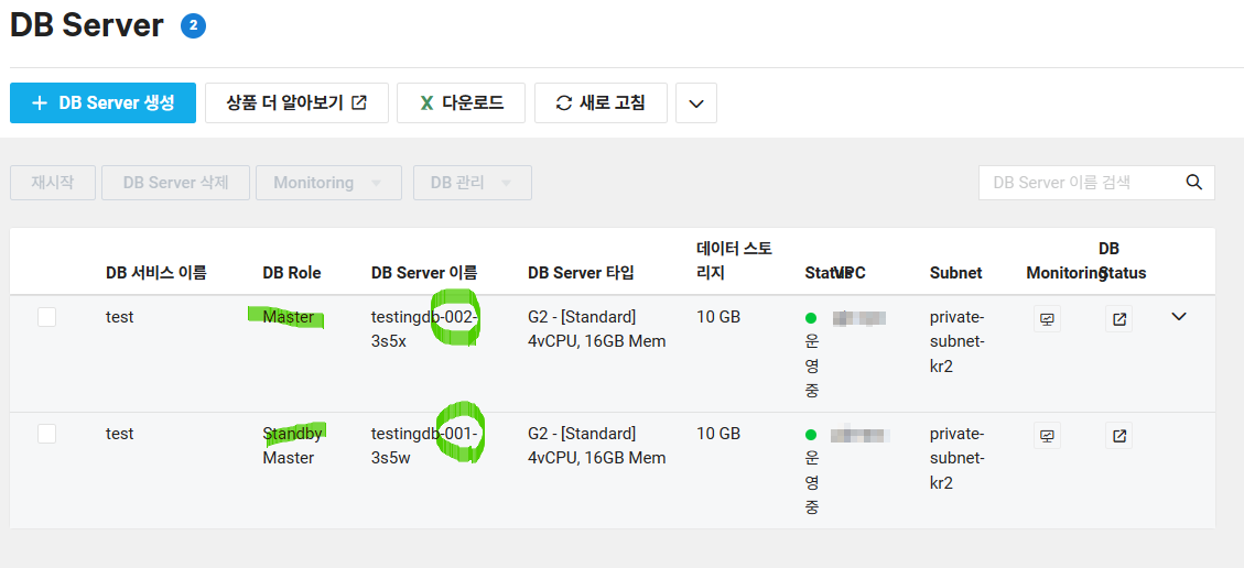 고가용성을 선택했기 때문에 위와 같이 DB서버는 2개가 생성되었고, Master와 Standby 2개가 있고, DB Server 타입에서 보면 001과 002 번호가 있으며, 자동으로 Fail-Over를 하면 Standby가 Master의 기능을 하기 때문에 001로 바뀐다.