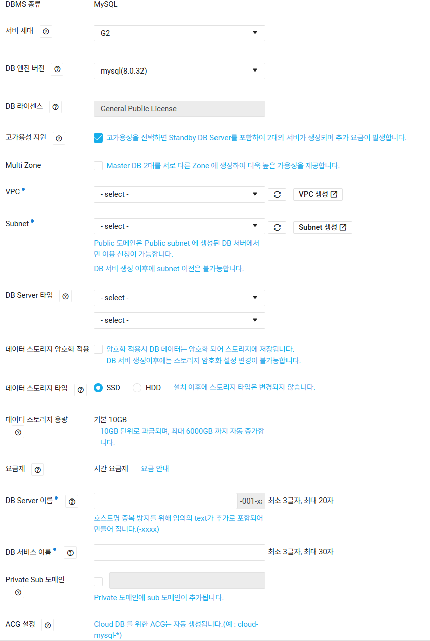- 그외에는 DB스토리지 타입,용량을 선택한다.