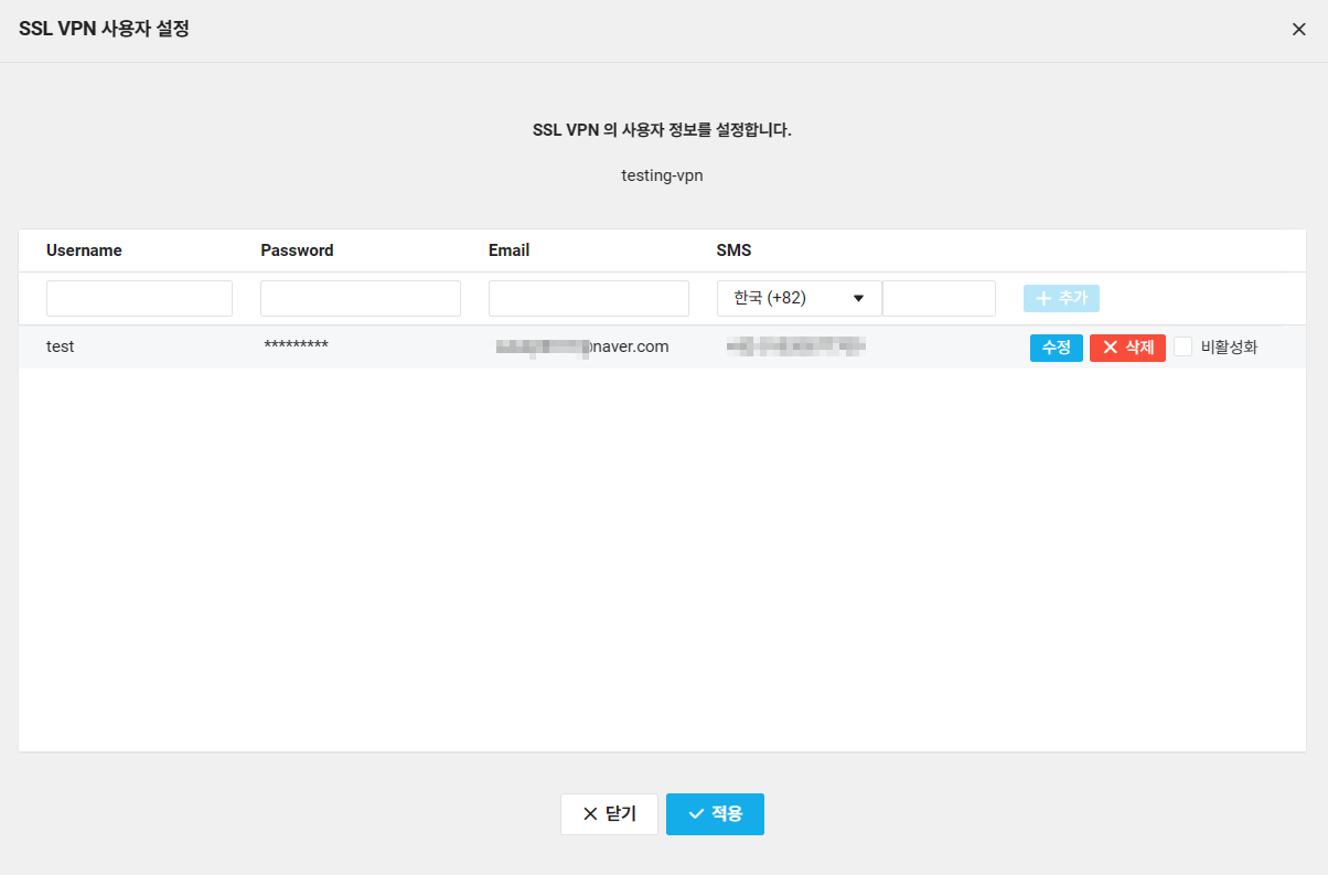 VPN 사용을 위해서 사용자설정을 진행한다. 해당 정보를 입력하면 VPN에 접속할 때 OTP를 받아 볼 수 있다.