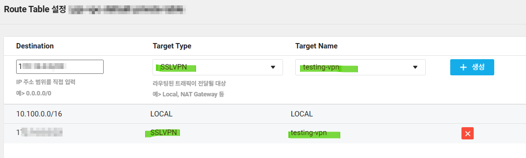 Route Table에서 SSL VPN의 IP를 입력하고, 만들어진 VPN을 Target으로 설정합니다.