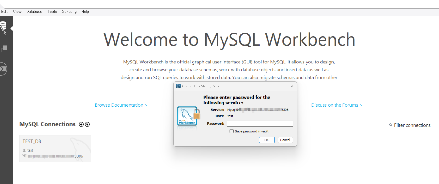 MySQL Workbench를 통해서 DB서버에 접속을 시도해본다.