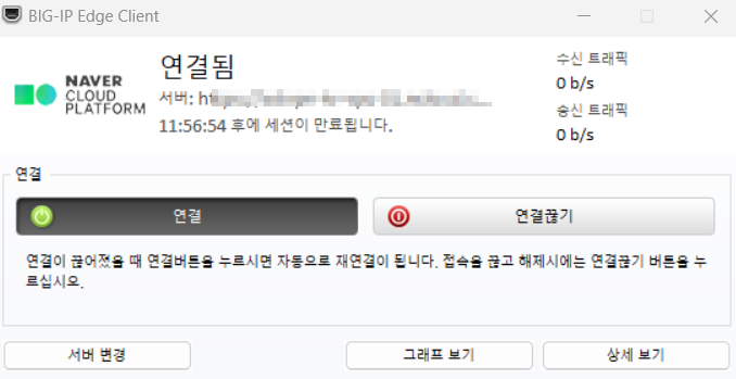 다운로드 받은 BIG-IP Edge Client를 실행하면 위와 같은 화면을 볼 수 있고, 서버를 VPN 접속 URL을 입력한다.