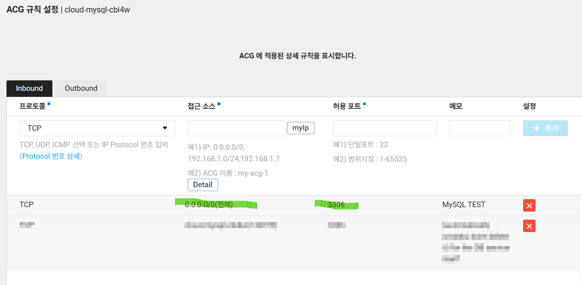ACG규칙에서 0.0.0.0/0으로 IP를 열어주고, 포트는 MySQL포트 3306을 설정 후 추가해준다.