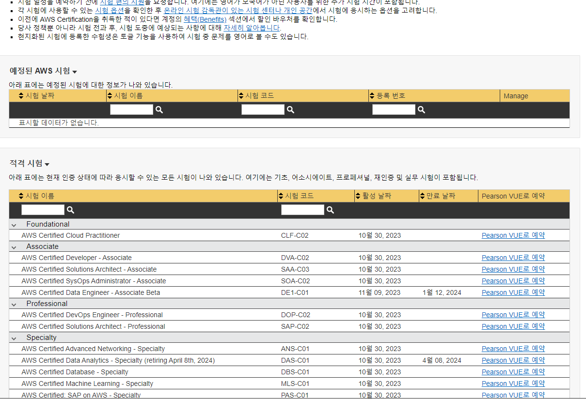 본인이 해당하는 시험을 확인 후 오른쪽에 Pearson VUE예약 버튼을 눌러 시험장과 시간을 예약하면 된다.