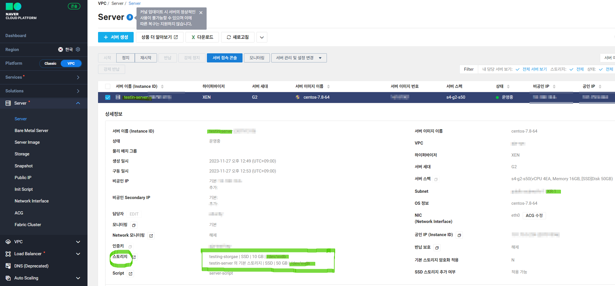 서버는 KR1에 만들었으며, 위 화면에서 스토리지 부분에 있는 디렉토리의 위치가 매우 중요하다.