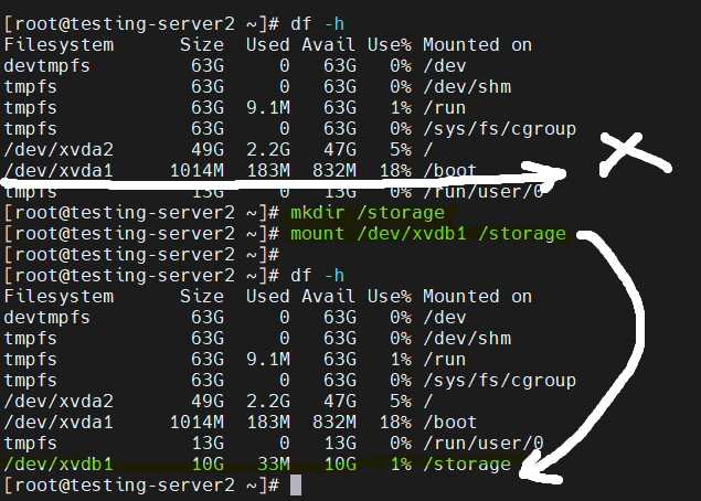 해당 서버 안에 mkdir 로 storage라는 디렉토리를 생성 후, /dev/xvdb1 스토리지를 /storage 디렉토리와 mount 명령어로 마운트 해준다.