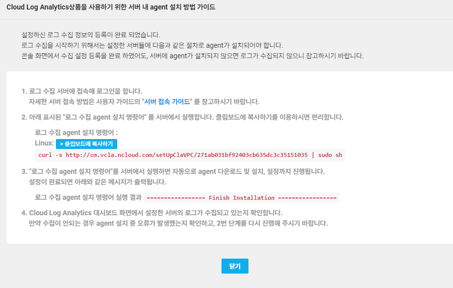 네이버 클라우드 플랫폼 가이드라인에 나온 것 처럼 Agent 설치 후 프로세스까지 확인 완료했다.