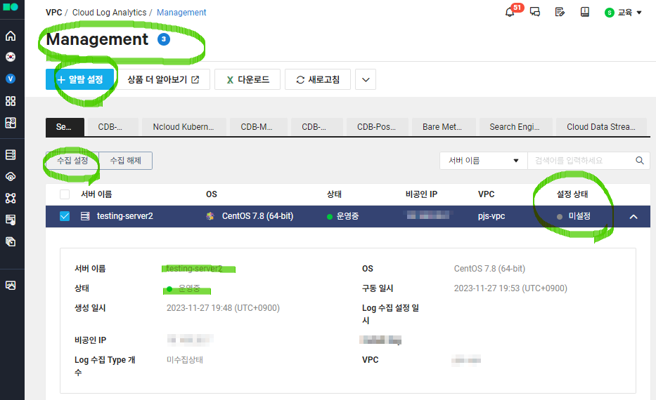 Cloud Log Analytics를 서비스를 신청하면, Management에서 Log를 확인하고 싶은 서비스를 선택해야한다.