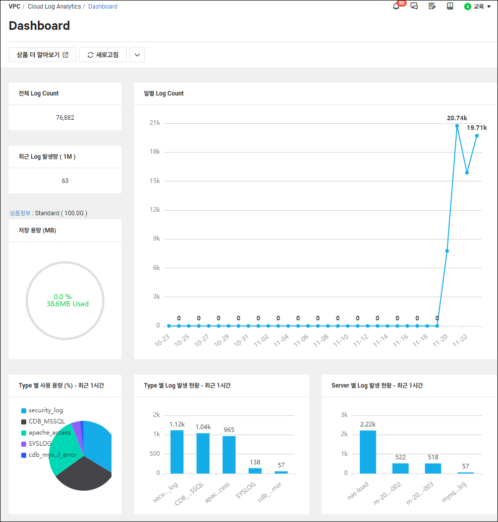 서버, Cloud DB, App Safer, Secure Zone Firewall 등 네이버 클라우드 플랫폼의 다양한 서비스에서 발생하는 로그를 한 번에 조회하고 분석할 수 있습니다.