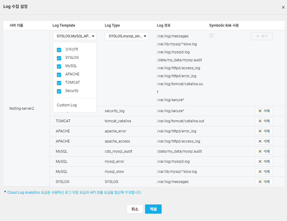 보면, SYSLOG, APACHE, TOMCAT 등 다양한 Log Template가 있다. 일단은 테스트이기 때문에 전부 다 선택 후 적용 버튼을 누른다.