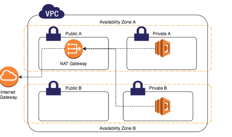NAT gateway는 대표IP를 가지고 외부서버와 접속을 할 수 있는 기능이다. 즉, 프라이빗 서브넷의 인스턴스가 VPC 외부의 서비스에 연결할 수 있지만 외부 서비스에서 이러한 인스턴스와의 연결을 시작할 수 없도록 NAT 게이트웨이를 사용이 가능하다.