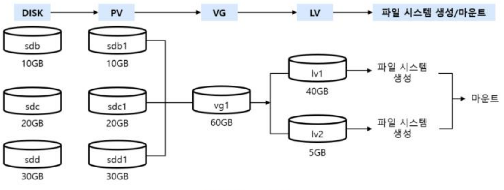 이 경우 저장 공간의 크기가 고정되어서 증설/축소가 어렵다. 이를 보완하기 위한 방법으로 LVM을 구성할 수 있다.