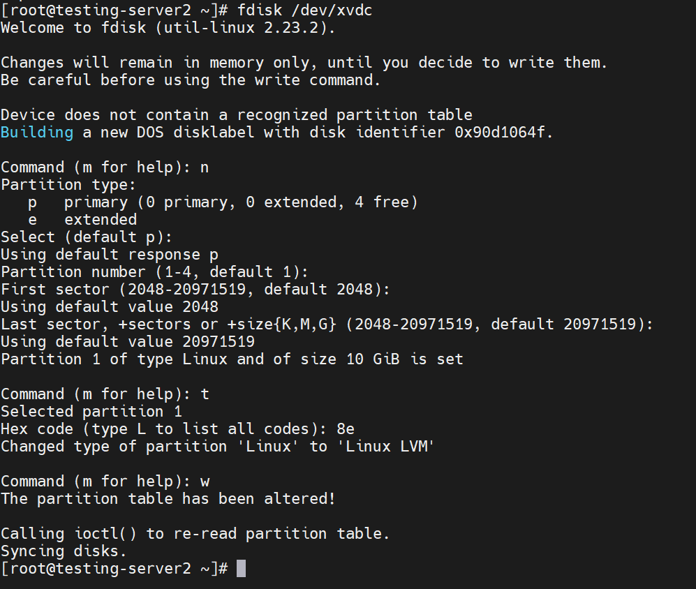 위와 같은 명령어를 입력 후, 파티션 작업을 해주는데 중요한 것은 중간에 Command에서 t 와 Hex Code 8e를 입력해주면 마지막에 Linux LVM이라는 명령어가 나오는 것을 확인 할 수 있다.