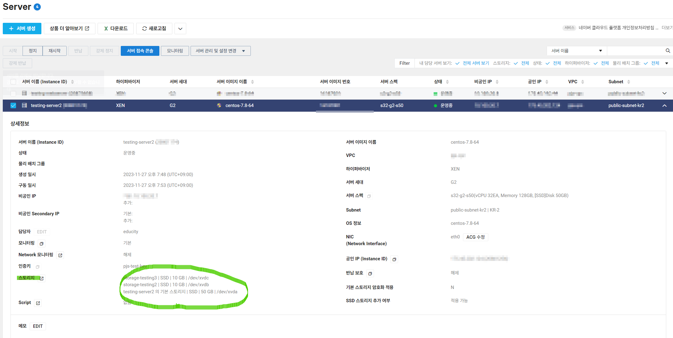 테스트용 서버를 하나 생성 후, 거기에 블록스토리지를 콘솔에서 2개를 제작 후, 연결되어 있는 서버이다.