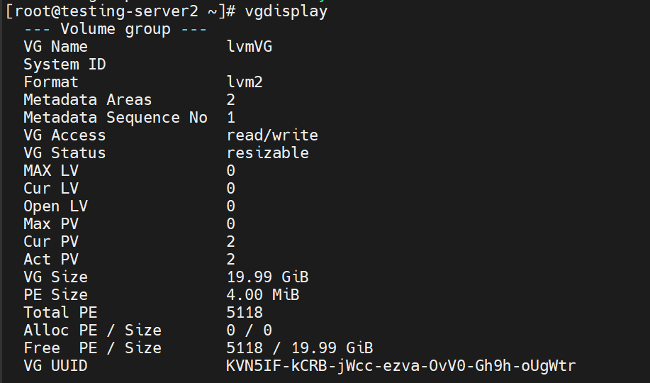 PV가 2개이고, 10G 2개의 디스크가 합쳐졌기 때문에 VG Size는 19.99G이다.