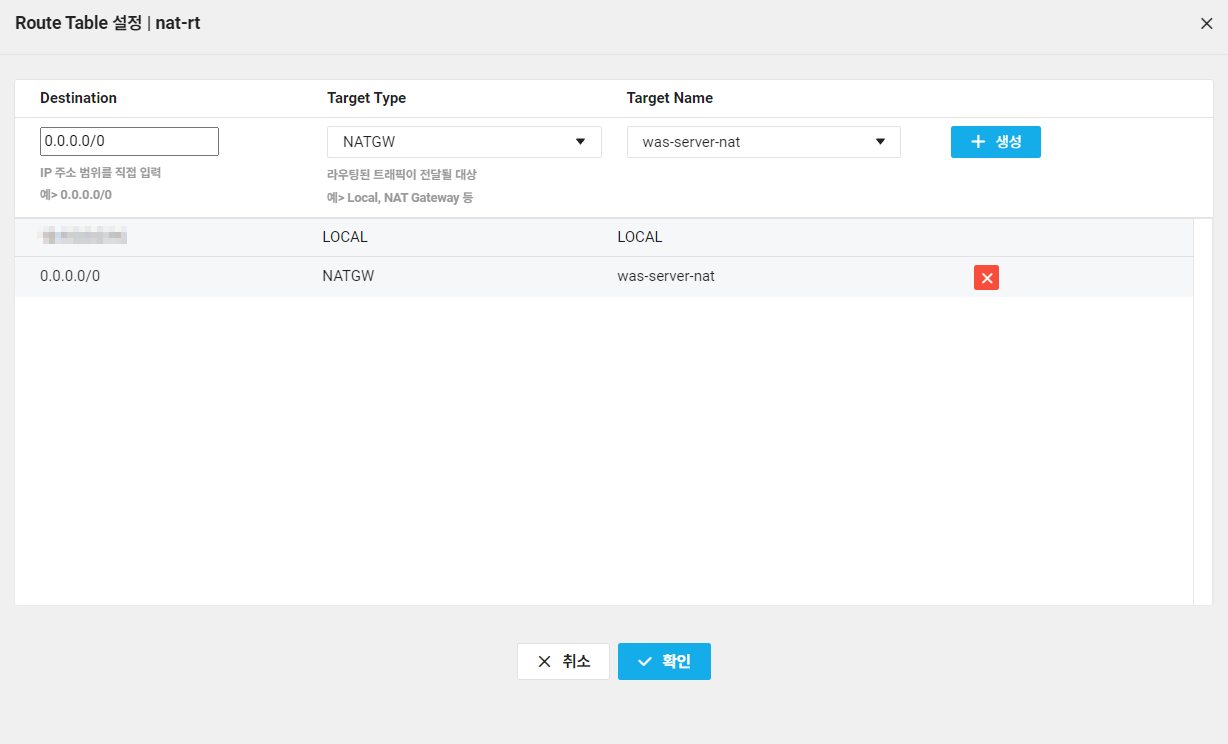 Route Table 설정에서 NAT Gateway용 도착지점으로 0.0.0.0/0 으로 전체로 설정해준다.