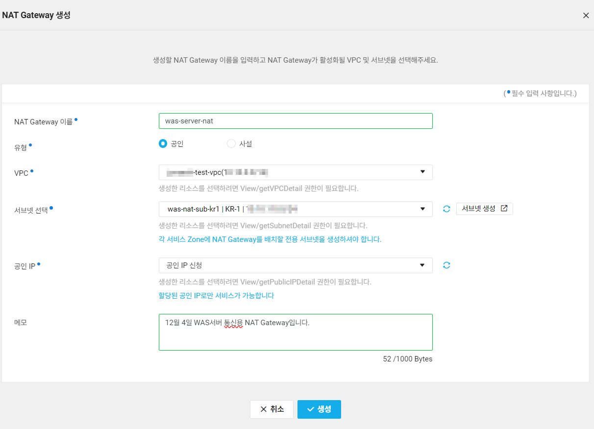 NAT Gateway를 생성한다. WEB 서버와 통신을 해야하니까 공인IP를 신청한다.