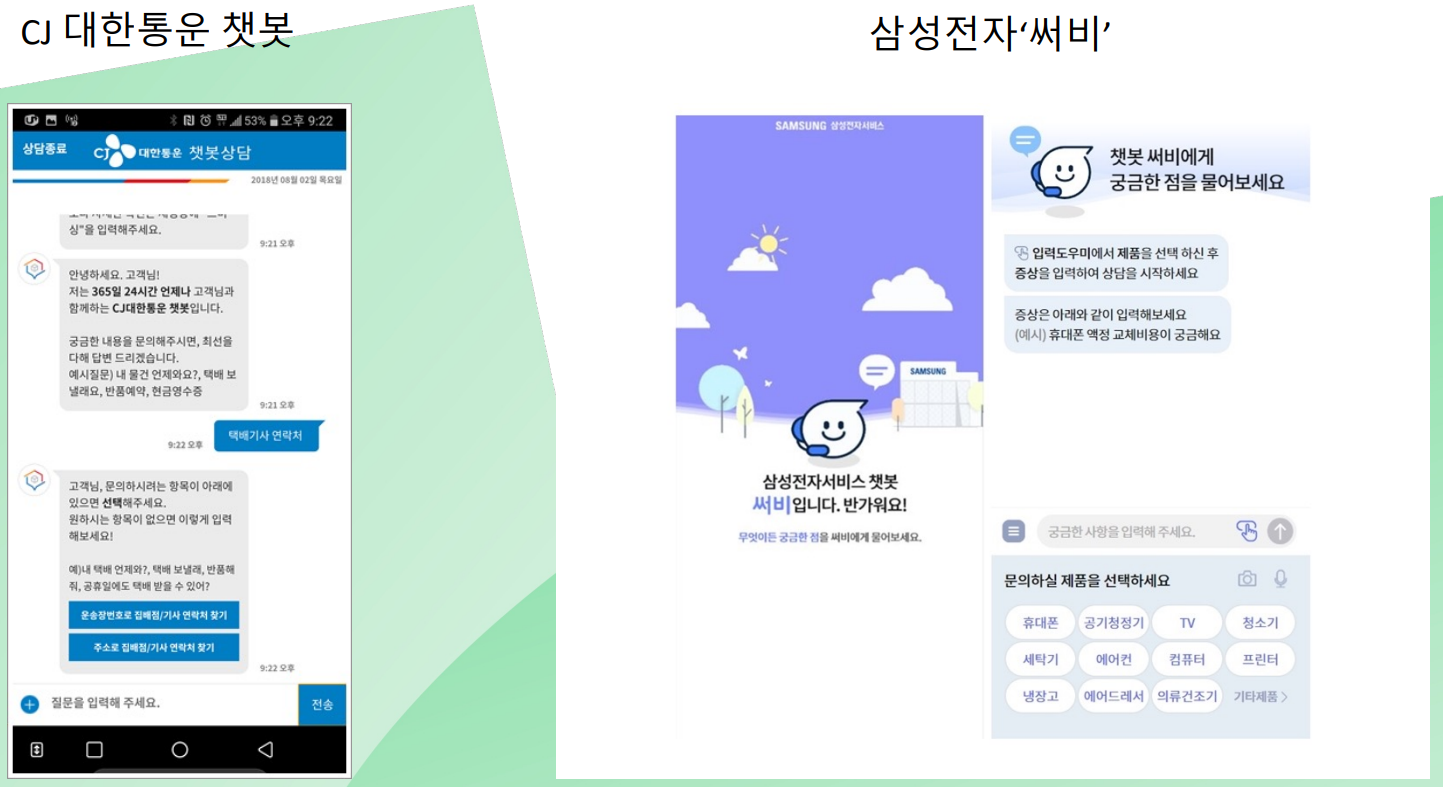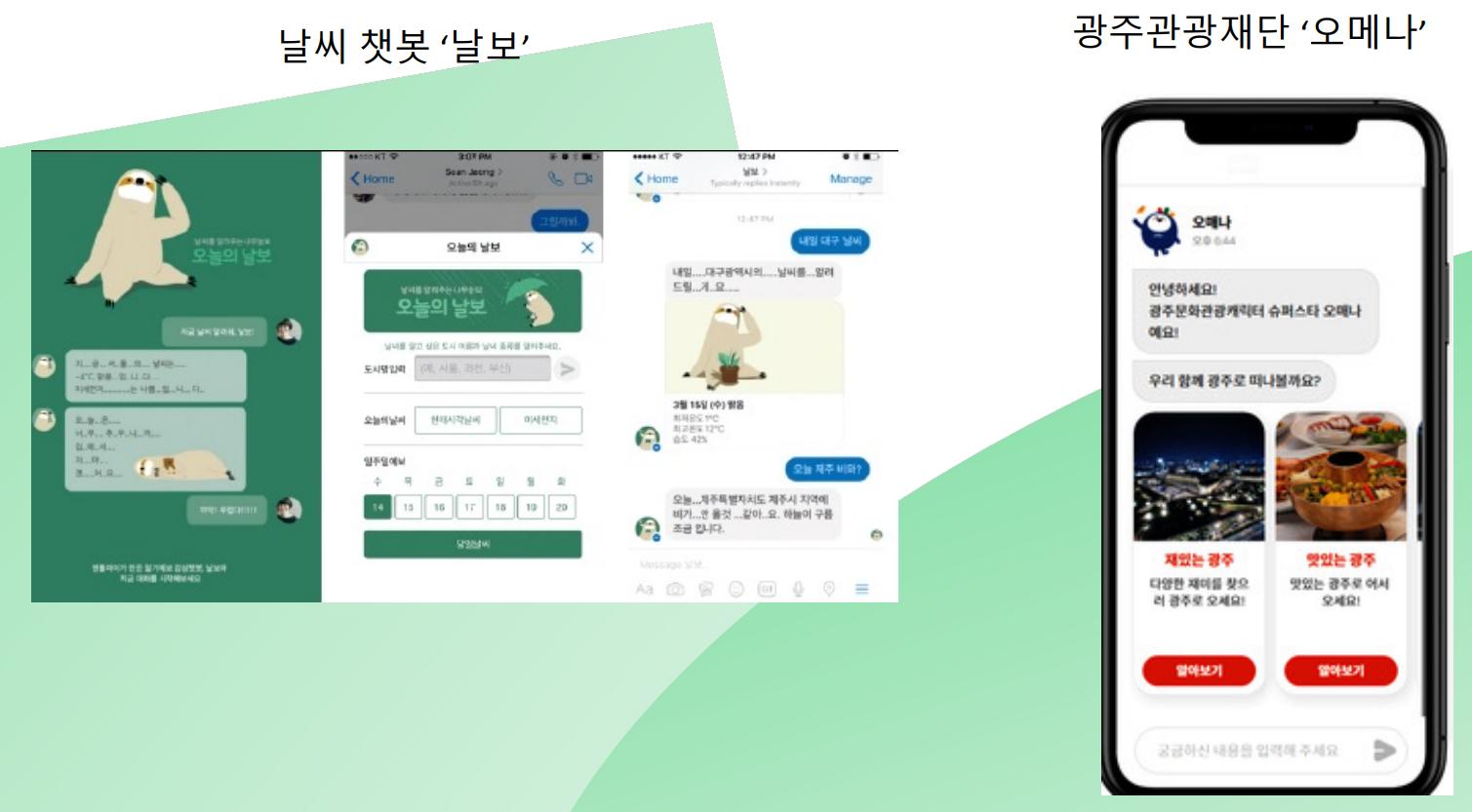 • 문자 또는 음성으로 대화하는 기능이 있는 컴퓨터 프로그램 또는 인공지능(한국정보통신기술협회)