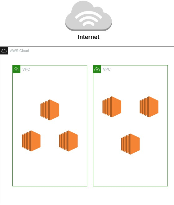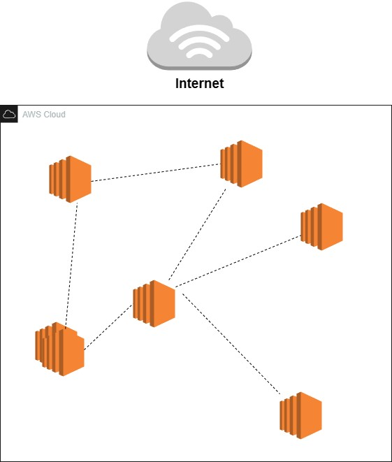 위 그림과 같이 하나의 인터넷을 사용하는 클라우드 안에 EC2 즉, 가상 컴퓨터들끼리 자유롭게 연결이 되어있다고 가정해보자. 관리하기가 매우 불편하고 EC2 하나하나 관리를 해줘야하는 불편함이 있다.