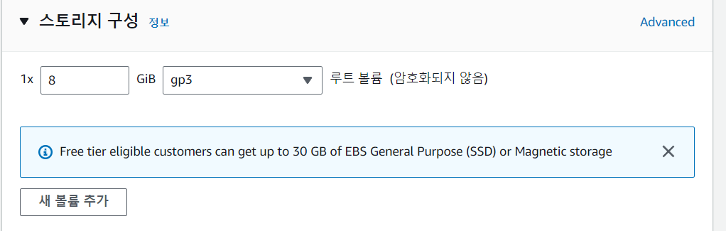 - Type : t2.micro, CPU : 1Core, Mem : 1GB, Disk : SSD(gp3) 30GB