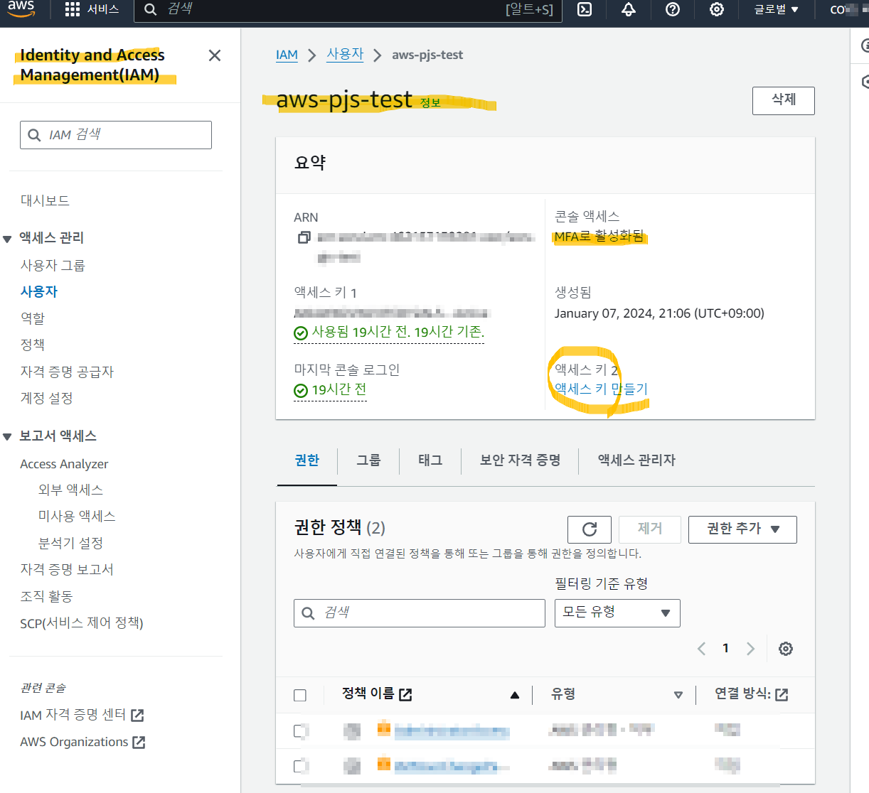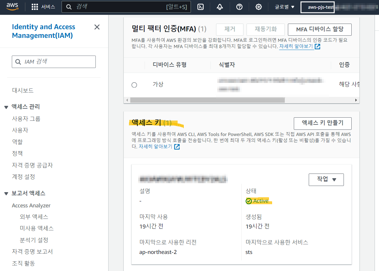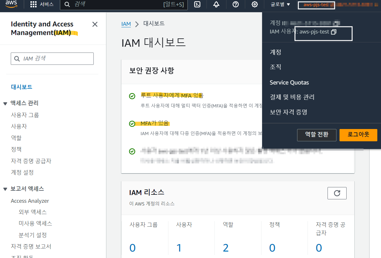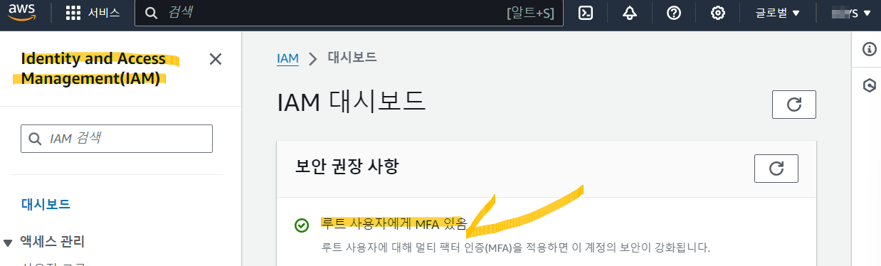 2. 루트 계정을 로그인하시고 MFA 설정을 해주세요.