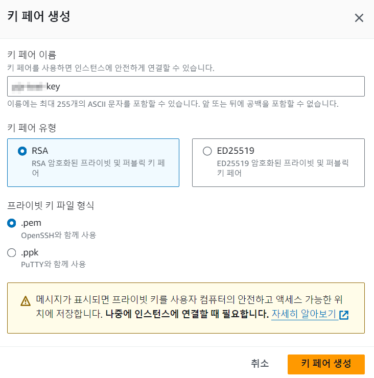 1. Keypair를 RSA 유형을 적용하여 .pem 파일 형식으로 생성