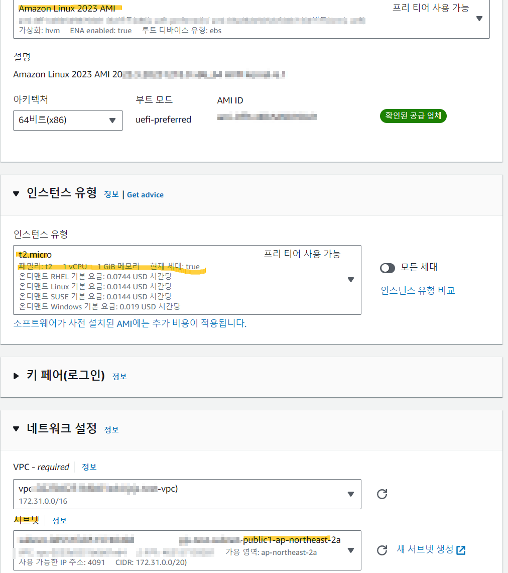 - 네트워크 : 생성된 Subnet 중 택1 - OS : Amazon Linux 2023 - Keypair : 앞서 생성한 Keypair 등록