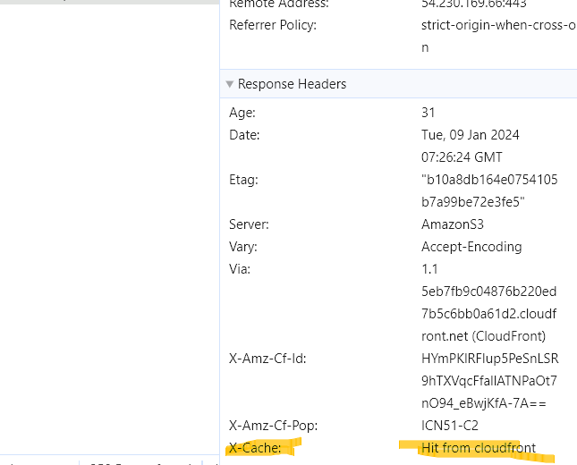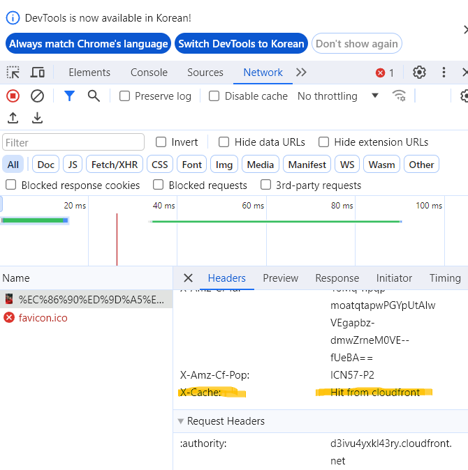 엣지로케이션에서 데이터가 캐싱이 되어 넘어온다면 위와 같이 X-Cache가 Hit로 바뀐다!