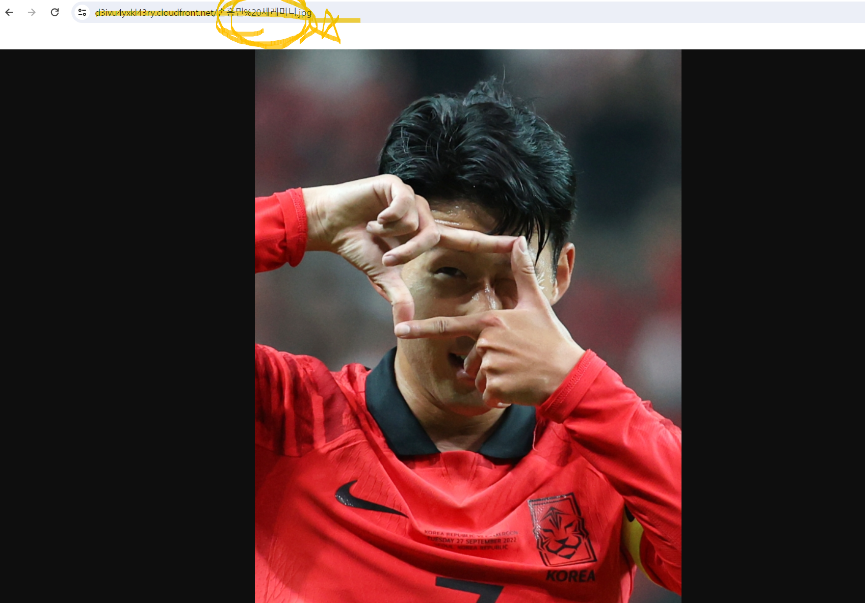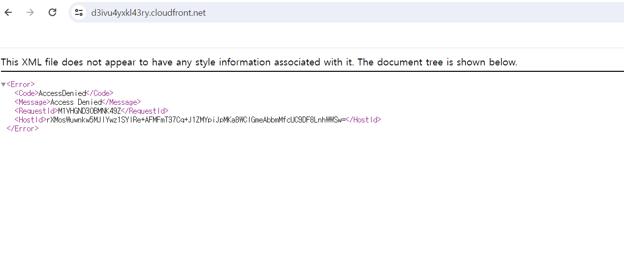 해당 S3에 있는 파일에 접근이 되어있지 않기 때문에 위 도메인주소 뒤에 S3에 있는 파일명을 입력한다.
