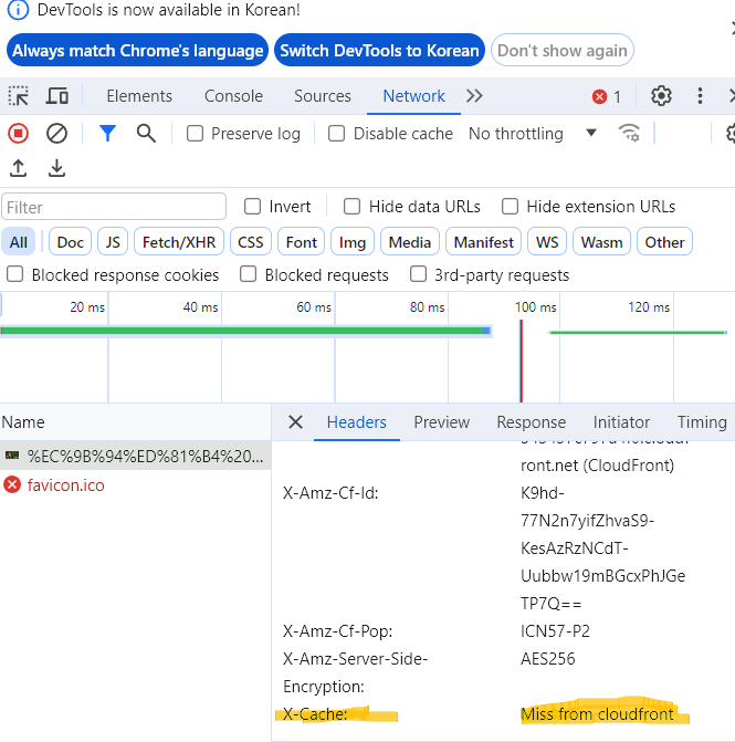 처음에는 엣지로케이션에 원본을 요청하기 때문에 X-Cache가 Miss가 뜬다.
