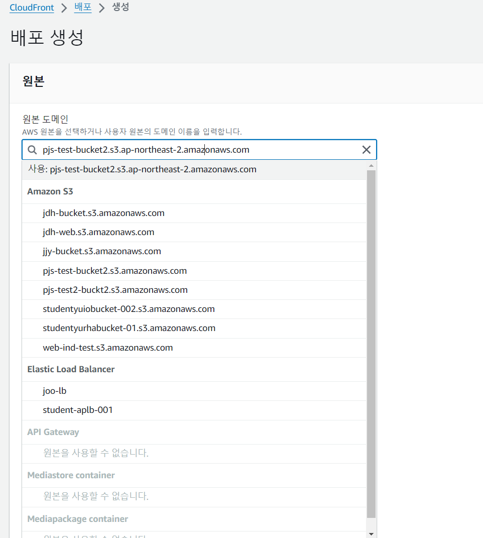 즉, 연결하는 원본 도메인을 선택한다. API, S3, ELB 등 다양한 서비스와 연동이 가능하다.