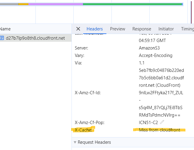 처음에는 엣지로케이션에 원본을 요청하기 때문에 X-Cache가 Miss가 뜬다.