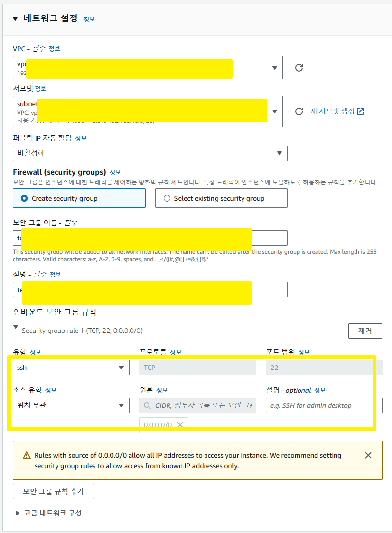 - 위치무관으로 해둘 경우 0.0.0.0/0이지만, 모든 포트를 오픈할 경우에 실제로 서버를 탈취해 비트코인 채굴로 사용해 요금이 과금되는 사례가 발생하니 생성 후 주기적으로 체크해야한다.