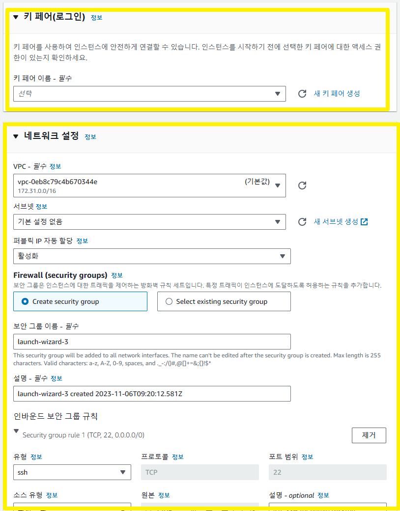 - 키페어를 선택 후, 네트워크 설정을 해준다.