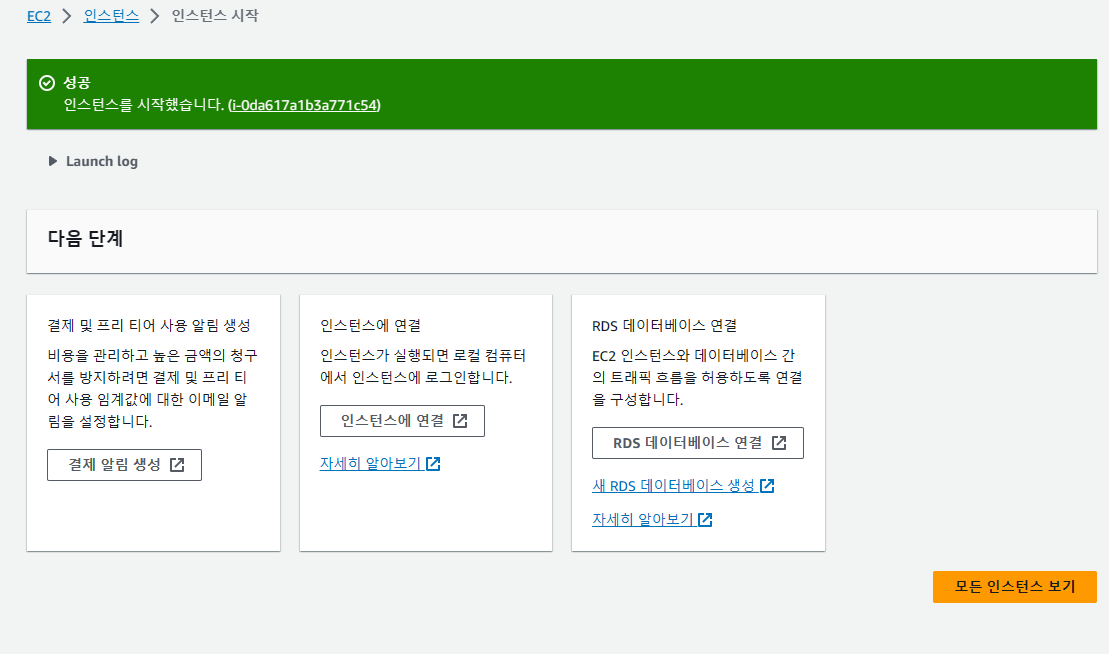 - 모두 설정이 완료되면 인스턴스 시작을 눌러 서버를 생성하면 된다.