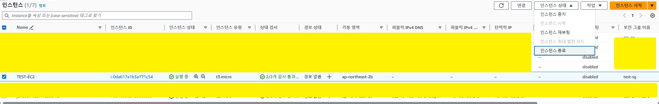 - 인스턴스 종료의 경우 해당하는 인스턴스를 선택 후 우측 상단 인스턴스 상태 메뉴에서인스턴스 종료를 선택하면 된다.
