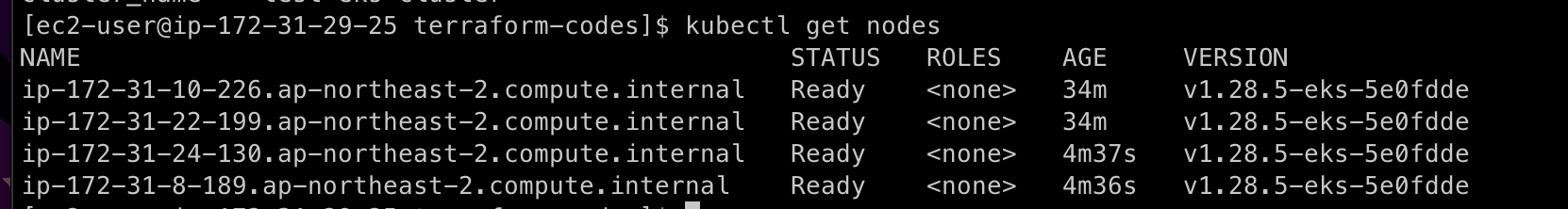 kubectl get nodes 명령어를 통해 총 노드가 4개가 된 것을 볼 수 있다.