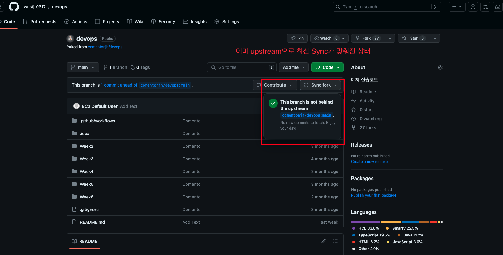 1. 원본 예제코드 변경사항을 Sync해 주세요. - 예제코드 URL : https://github.com/comentonjh/devops