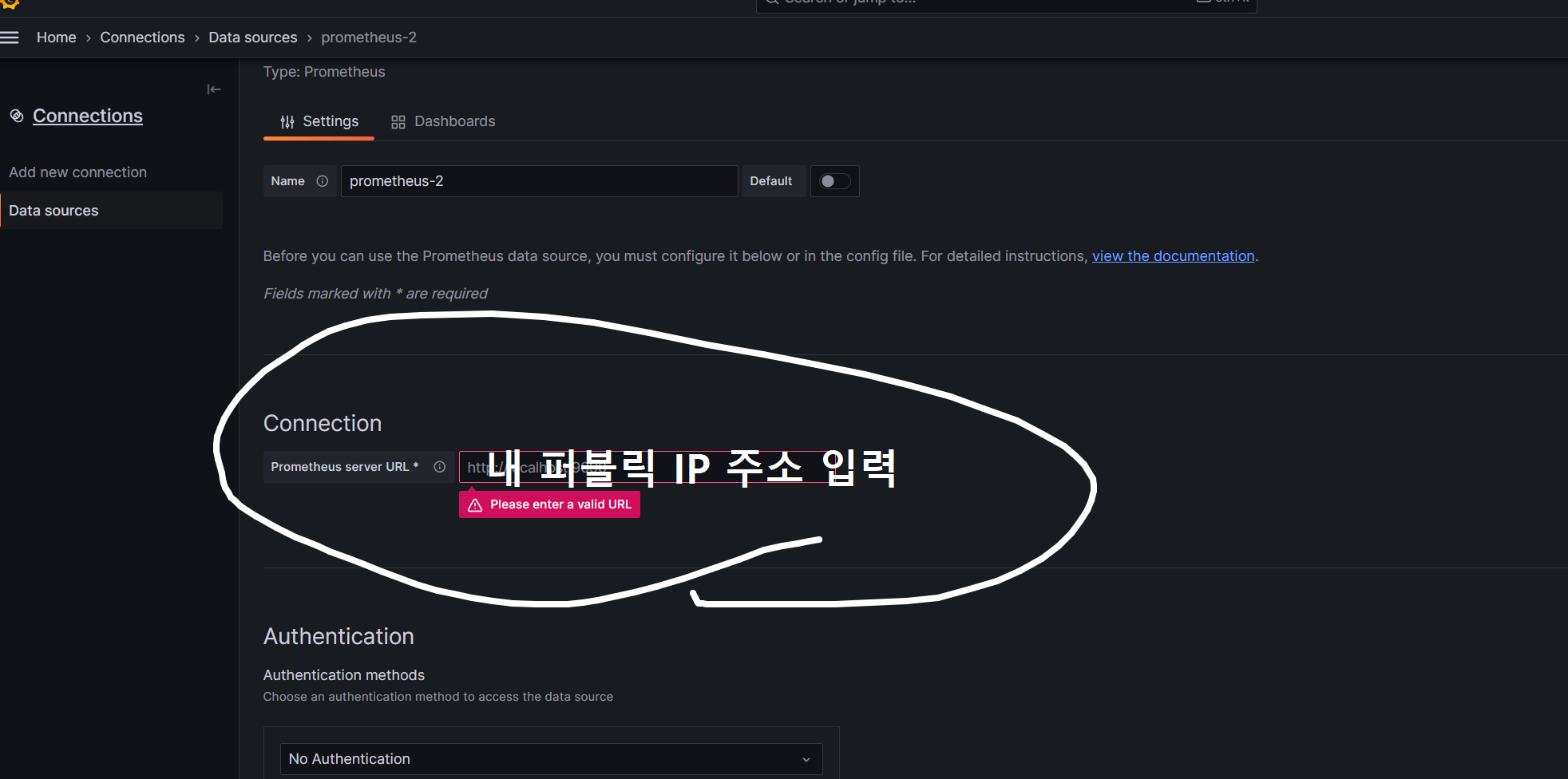 Connection에서 URL은 현재 서버에서 그라파다가 구동중인 웹서버 퍼블릭IP를 적는다.