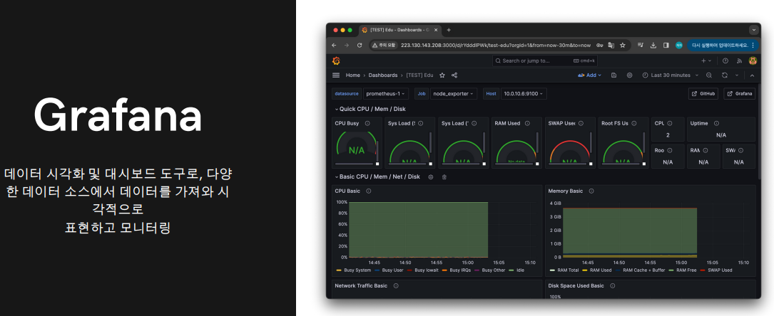 노드 익스포터에서 가져와서 데이터(시계열)를 기반으로 그라파나에 띄워준다.