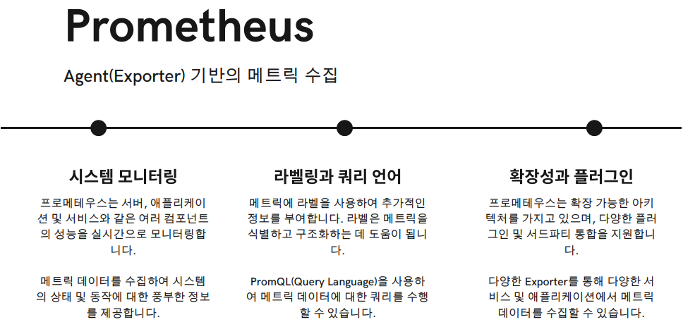 - 프로메테우스가 주기적으로 exporter(모니터링 대상 시스템)로부터 pulling 방식으로 메트릭을 읽어서 수집한다.