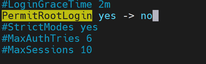 sudoers에 PermitRootLogin 코드에서 yes라고 되어있는 것을 no로 바꾼다.
