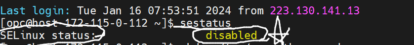 sestatus를 했을 시 disalbed가 뜬다. 이러면 오라클 서버의 방화벽이 전부 해제가 된 상태이다.