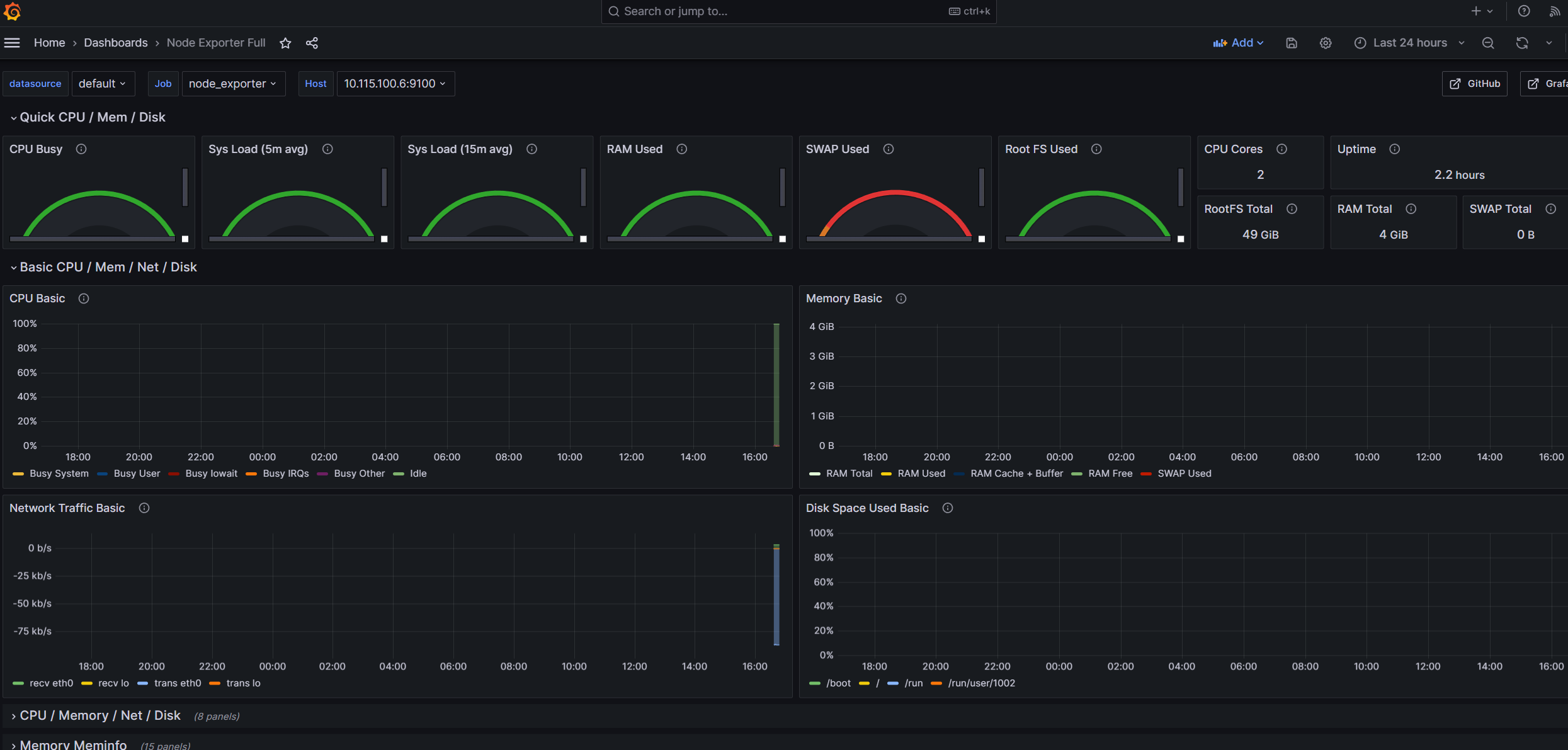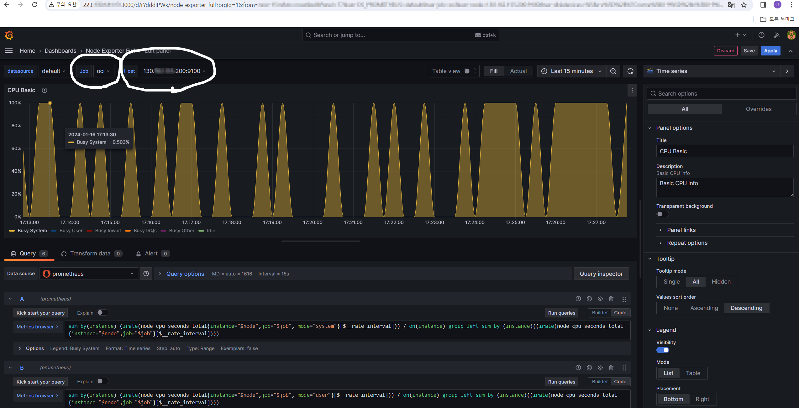 OCI를 선택하면 HOST IP가 확인이 되고, CPU 상태가 시간별로 대시보드화 된 것을 확인 할 수 있다.