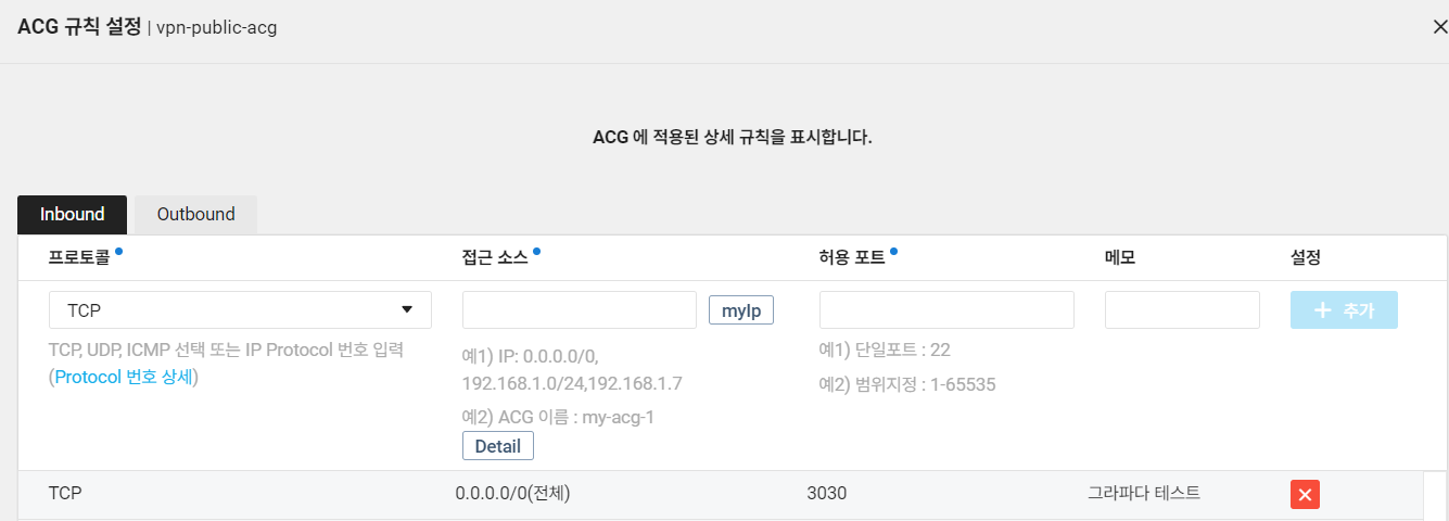 그라파다 또한 웹서버와 통신을 해야하기 때문에 public-acg에 3030포트로 TCP 열어준다!!