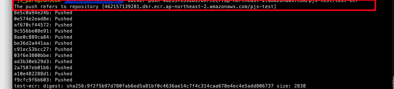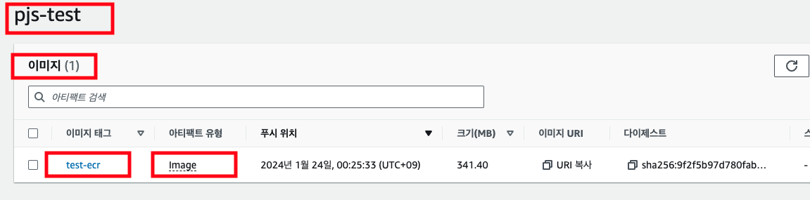 • AWS ECR에서 Push된 컨테이너 이미지 저장 상태 확인