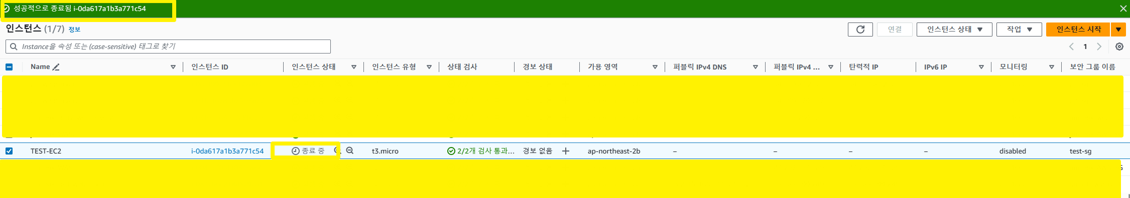 - 인스턴스 종료의 경우 해당하는 인스턴스를 선택 후 우측 상단 인스턴스 상태 메뉴에서인스턴스 종료를 선택하면 된다.