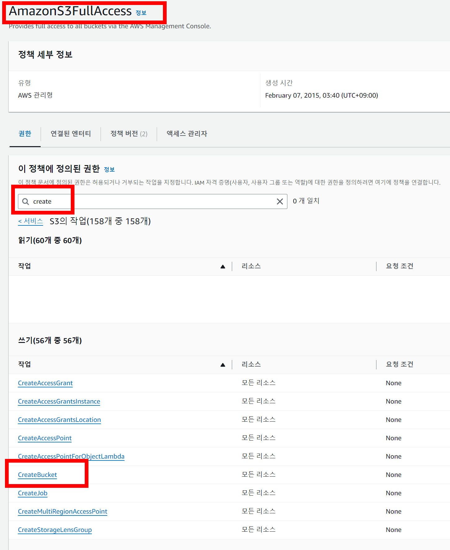 해당 정책을 클릭하면 정책이 있는 사이트로 연결이 되면서 권한에서 create를 검색하면 CreateBucket이라는 정책이 있는 것을 확인할 수 있다.