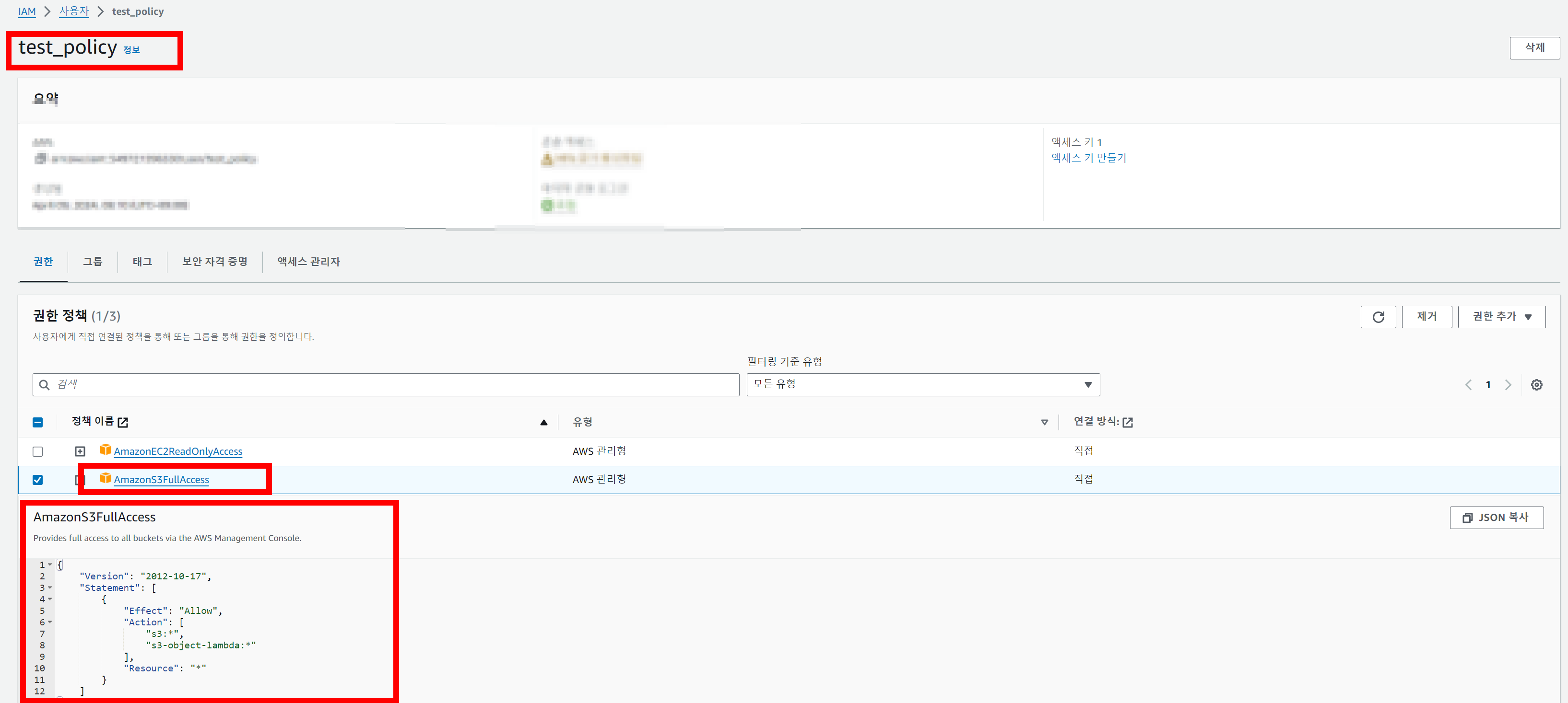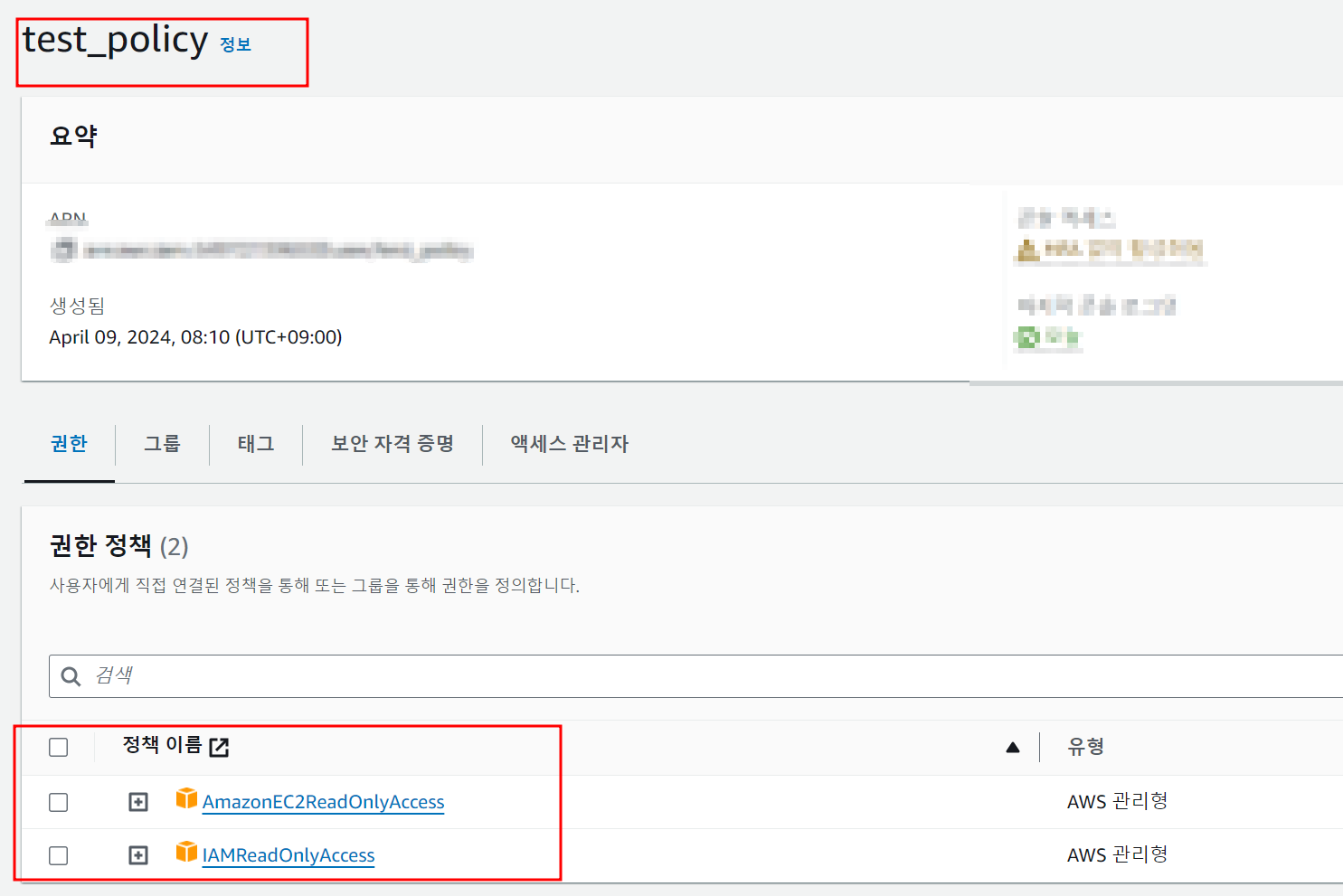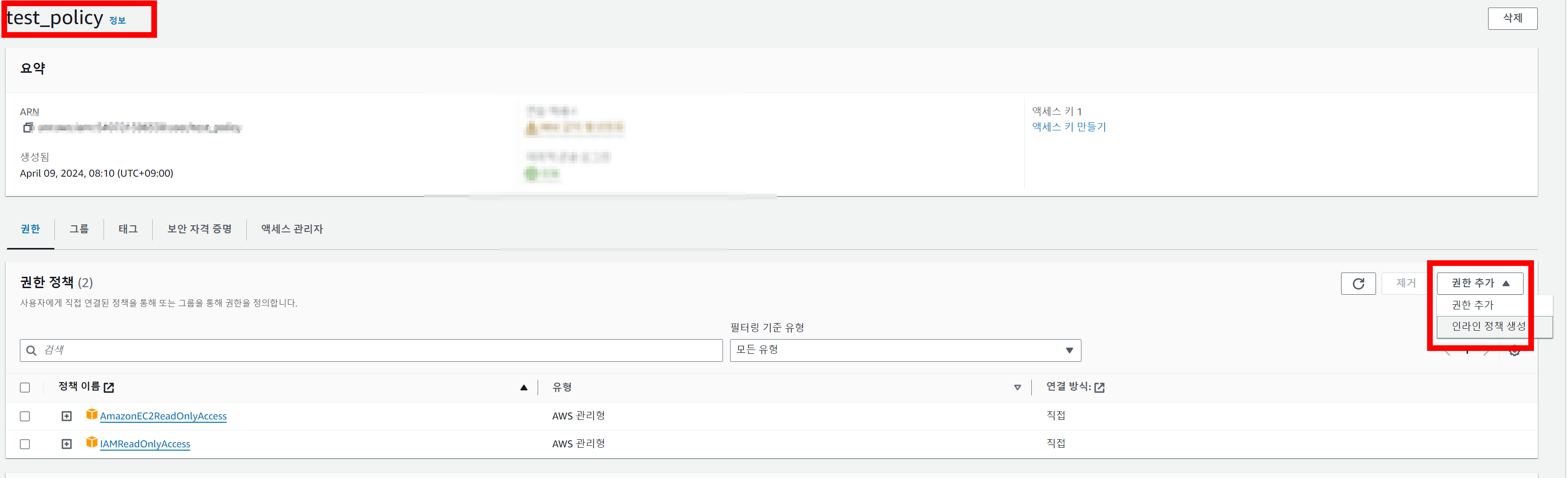 기존에 루트계정에서 IAM 서비스에서 test_policy라는 계정을 만들고 권한에 두가지를 부여했다.