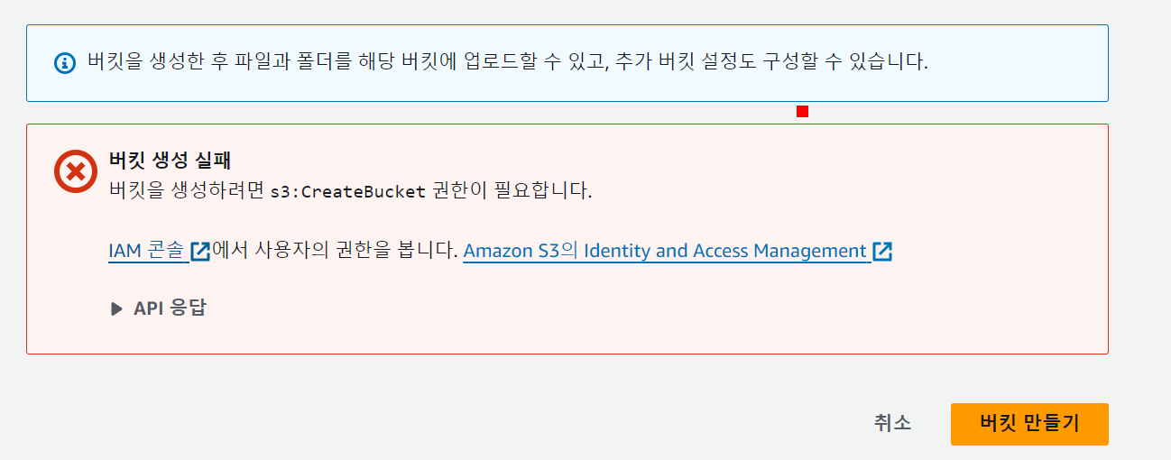 s3 : CreateBucket 권한이 필요합니다. 라는 메세지와 함께 IAM을 확인하라고 나온다.